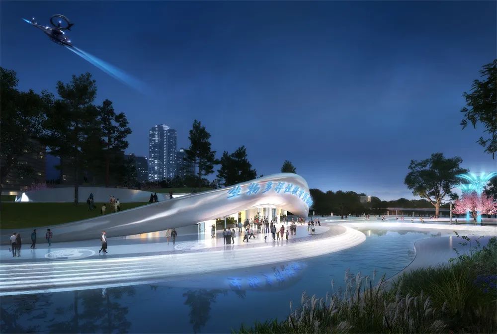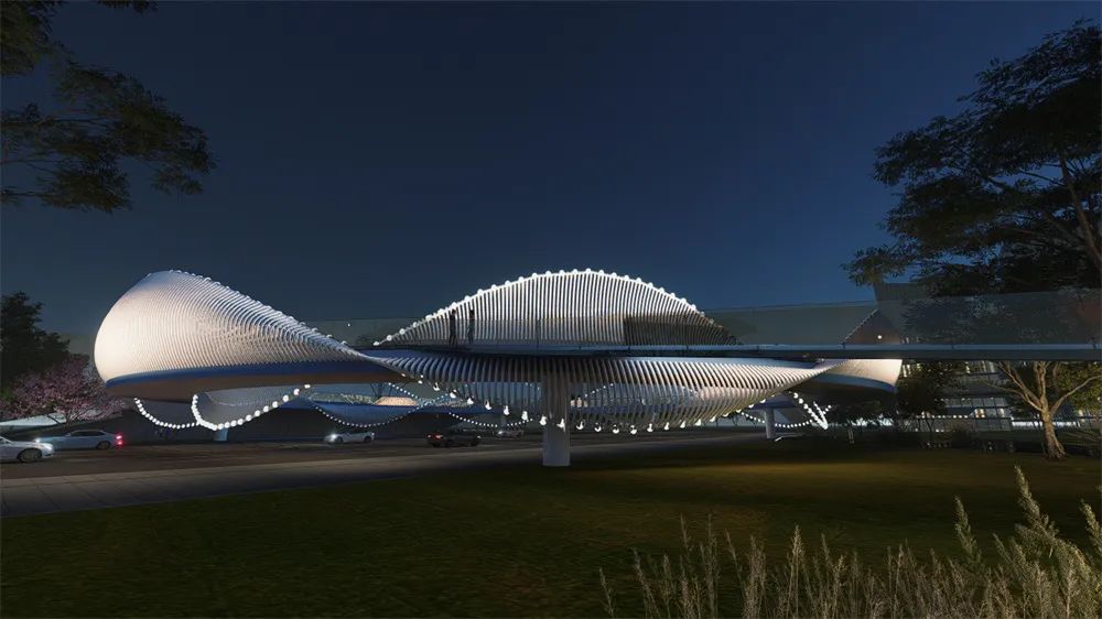 設(shè)計(jì)環(huán)形人行天橋,猶如一朵盛開的嬌艷的花,有機(jī)聯(lián)系起項(xiàng)目的南北地塊,同時(shí)兼顧新區(qū) 大道的人行過街功能,結(jié)合燈光藝術(shù)營造,也將成為該片區(qū)一個(gè)標(biāo)志性的打卡點(diǎn),象征著雅安因多樣而美麗,因共生而繁盛;颦h(huán)圍欄展示雅安特色物種。地面燈光按植物花色進(jìn)行分段布置,同時(shí)通過投影設(shè)備和交互式燈光等設(shè)施,增加游人體驗(yàn)感。環(huán)形橋跨越機(jī)動(dòng)車道,基因環(huán)的出現(xiàn)開始了生物密碼的探索之旅。