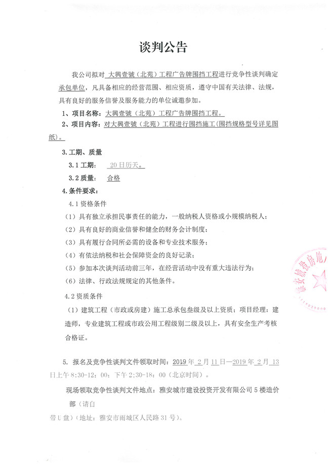 大興壹號(hào)(北苑)工程廣告牌圍擋工程競爭性談判公告