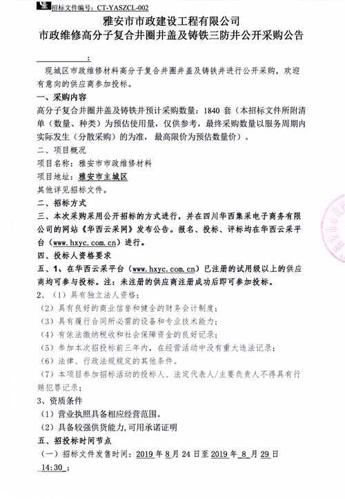 市政維修高分子復合井圈井蓋及鑄鐵三防井公開采購公告