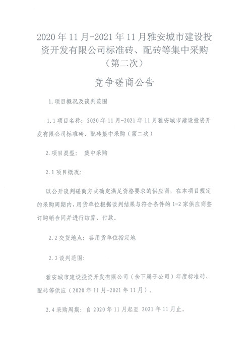 2020年11月-2021年11月雅安城市建設投資開發(fā)有限公司標準磚、配磚等集中采購(第二次)競爭磋商公告