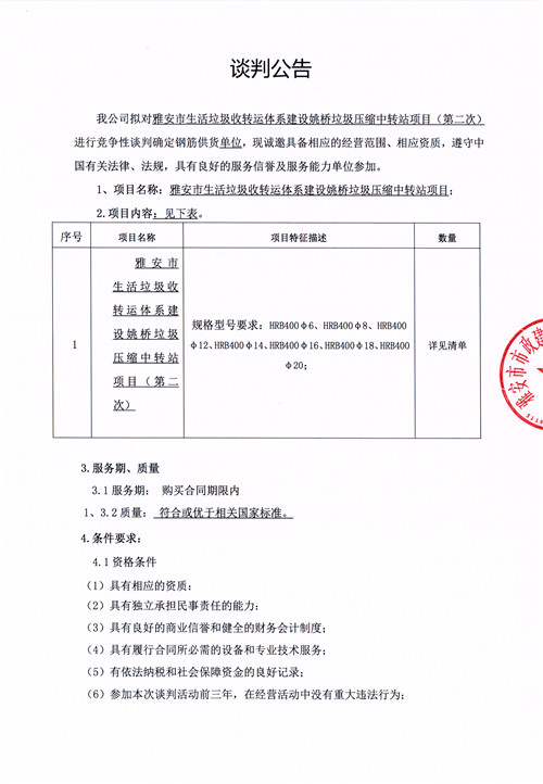 雅安市生活垃圾轉(zhuǎn)運(yùn)體系建設(shè)姚橋垃圾壓縮中轉(zhuǎn)站項(xiàng)目確定鋼筋供貨單位的競爭性談判公告(第二次)