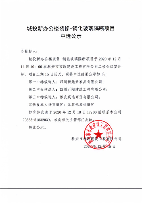 城投新辦公樓裝修-鋼化玻璃隔斷項(xiàng)目中選公示