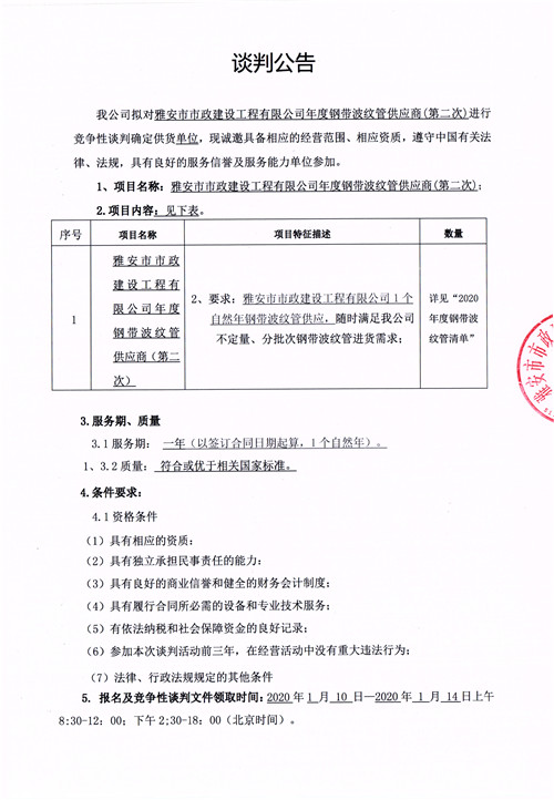 雅安市市政建設(shè)工程有限公司年度鋼帶波紋管供應(yīng)商競爭性談判公告(第二次)