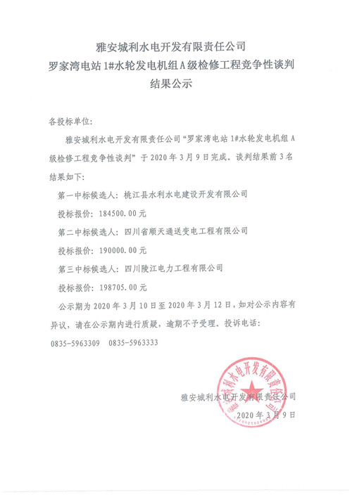 羅家灣電站1#水輪發(fā)電機(jī)組A級(jí)檢修工程競(jìng)爭(zhēng)性談判結(jié)果公示