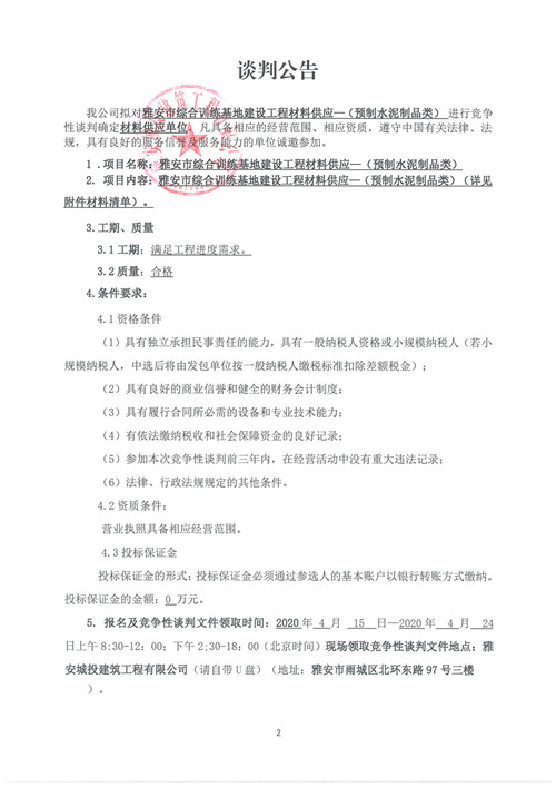 城投建工雅安市綜合訓(xùn)練基地建設(shè)工程材料供應(yīng)—(預(yù)制水泥制品類)競爭性談判公告