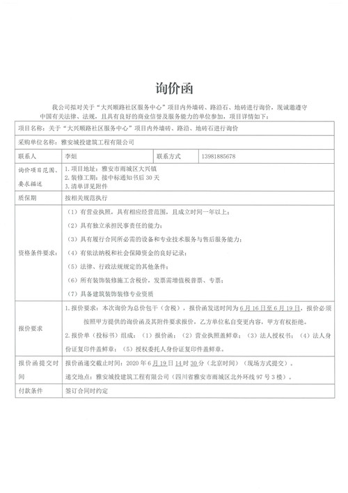 城投建工“大興順路社區(qū)服務中心”項目內(nèi)外墻磚、路沿石、地磚詢價函
