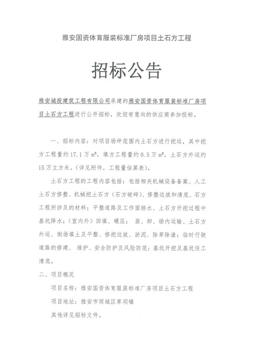 城投建工公司雅安國(guó)資體育服裝標(biāo)準(zhǔn)廠房項(xiàng)目土石方工程招標(biāo)公告