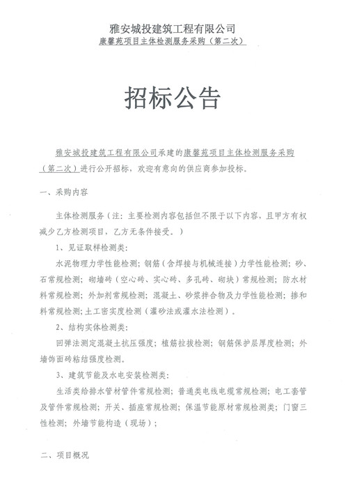 城投建工公司康馨苑項目主體檢測服務(wù)招標公告(第二次)