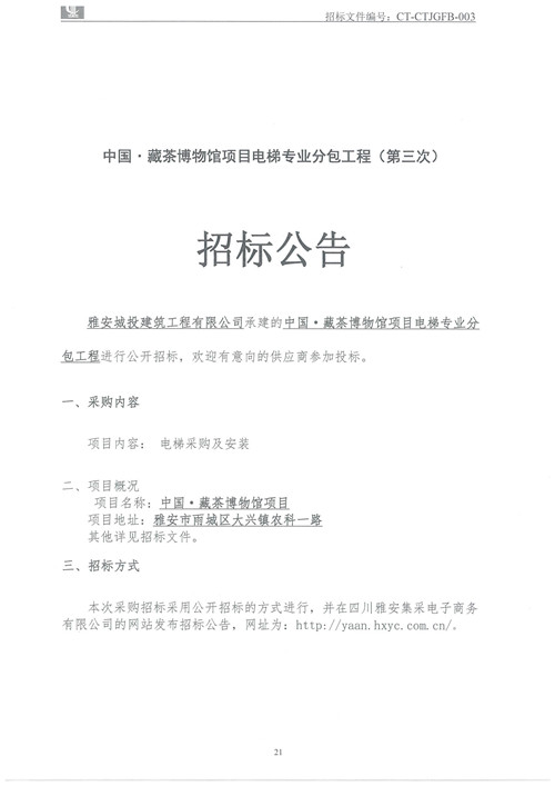 城投建工公司中國·藏茶博物館項目電梯專業(yè)分包工程招標(biāo)公告(第三次)