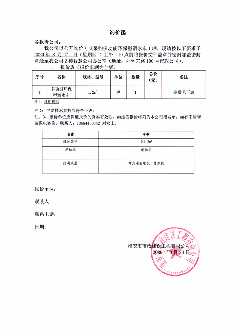 雅安市市政建設工程有限公司采購多功能環(huán)保型灑水車詢價函