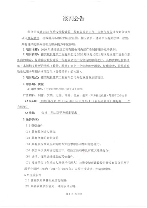 2020年雅安城投建筑工程有限公司內(nèi)部廣告制作服務(wù)競(jìng)爭(zhēng)性談判公告