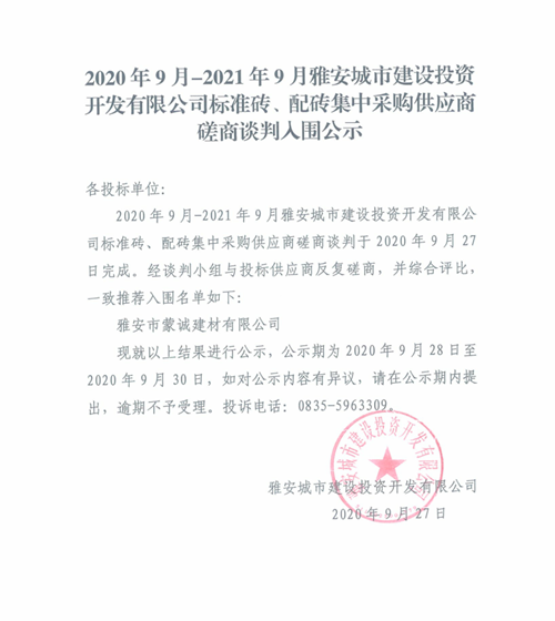 2020年9月-2021年9月雅安城市建設(shè)投資開(kāi)發(fā)有限公司標(biāo)準(zhǔn)磚、配磚集中采購(gòu)供應(yīng)商磋商談判入圍公示