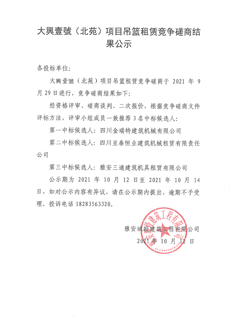 大興壹號(hào)(北苑)項(xiàng)目吊籃租賃競爭性磋商(第二次)結(jié)果公告