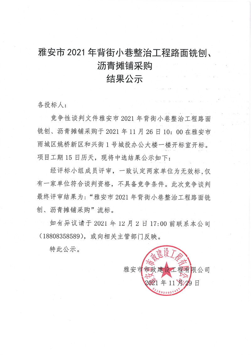 雅安市2021年背街小巷整治工程路面銑刨、瀝青攤鋪采購(gòu)結(jié)果公示