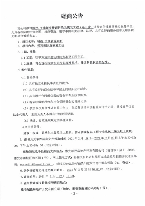 城投.文曲新座樓頂拆除及恢復(fù)工程(第三次)競爭性磋商公告