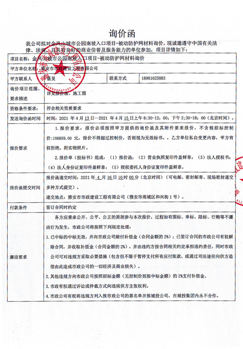 雅安市政公司金鳳山公園南坡入口項目-被動防護網(wǎng)材料詢價函