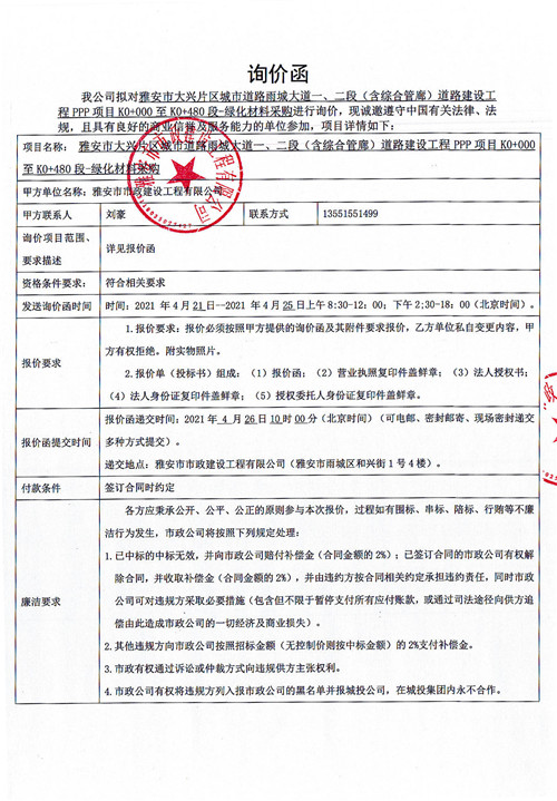 雅安市大興片區(qū)城市道路雨城大道一、二段(含綜合管廊)道路建設工程PPP項目K0+000至K0+480段-綠化材料采購詢價函