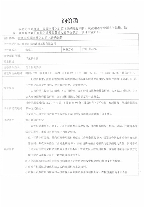 雅安市政公司金鳳山公園南坡入口苗木采購(gòu)詢價(jià)函