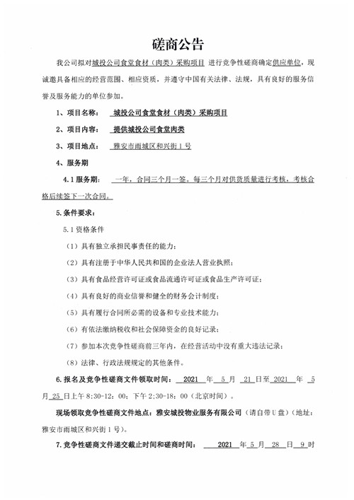 城投物業(yè)關于城投公司食堂食材(肉類)采購項目競爭性磋商公告
