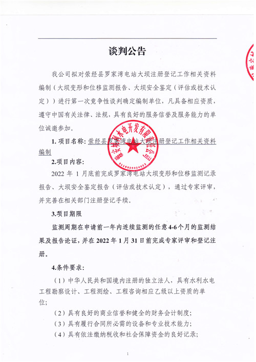 城利水電公司滎經(jīng)縣羅家灣電站大壩注冊登記工作相關(guān)資料編制競爭性談判公告