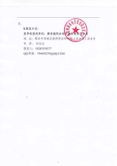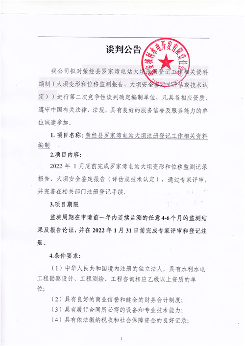 城利水電公司滎經(jīng)縣羅家灣電站大壩注冊(cè)登記工作相關(guān)資料編制競(jìng)爭(zhēng)性談判公告(第二次)