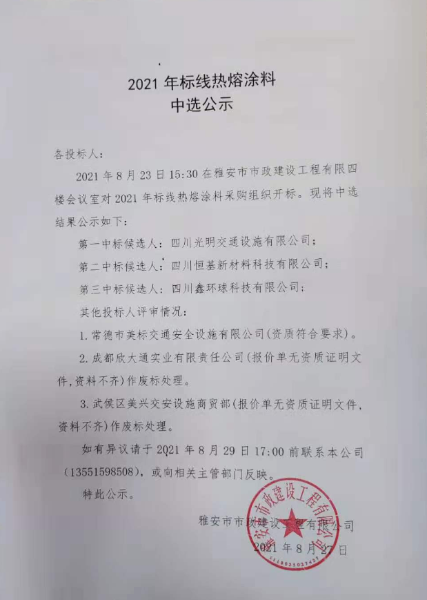 市政公司2021年標(biāo)線熱熔涂料詢價結(jié)果公示