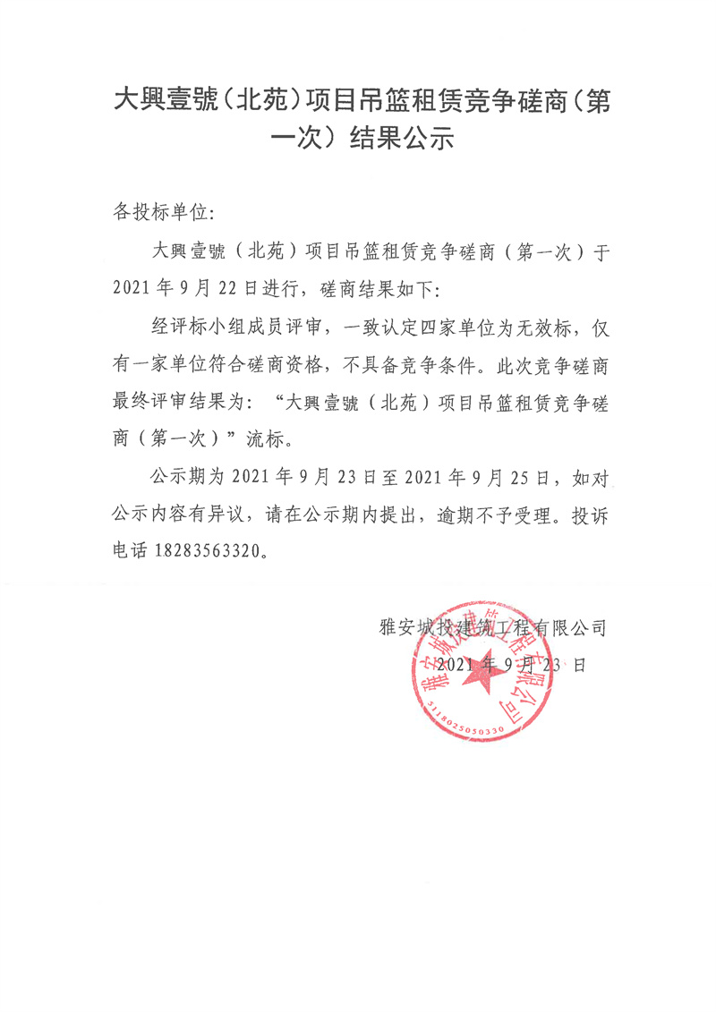 大興壹號(北苑)項目吊籃租賃競爭性磋商(第一次)結(jié)果公示