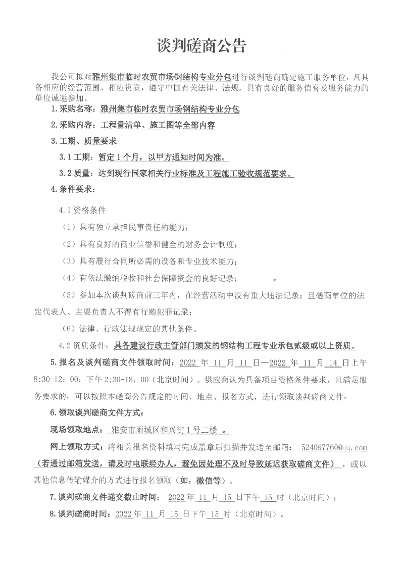 雅州集市臨時(shí)農(nóng)貿(mào)市場(chǎng)鋼結(jié)構(gòu)專業(yè)分包談判磋商公告