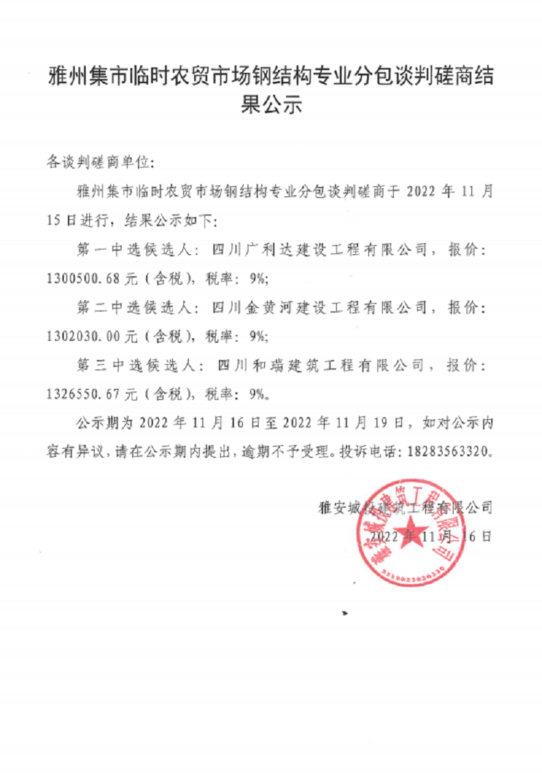 雅州集市臨時(shí)農(nóng)貿(mào)市場鋼結(jié)構(gòu)專業(yè)分包談判磋商結(jié)果公示
