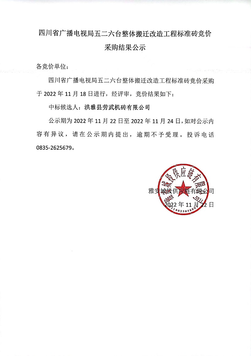 四川省廣播電視局五二六臺整體搬遷改造工程標(biāo)準(zhǔn)磚競價采購結(jié)果公示