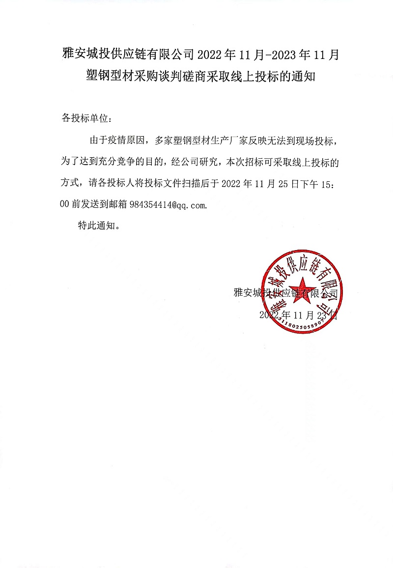 雅安城投供應(yīng)鏈有限公司2022年11月-2023年11月塑鋼型材采購談判磋商采取線上投標的通知