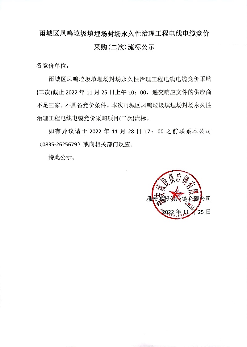 雨城區(qū)鳳鳴垃圾填埋場(chǎng)封場(chǎng)永久性治理工程電線電纜競(jìng)價(jià)采購(二次)流標(biāo)公示