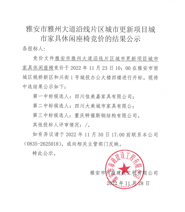 雅安市雅州大道沿線片區(qū)城市更新項(xiàng)目城市家具休閑座椅競價(jià)的結(jié)果公示