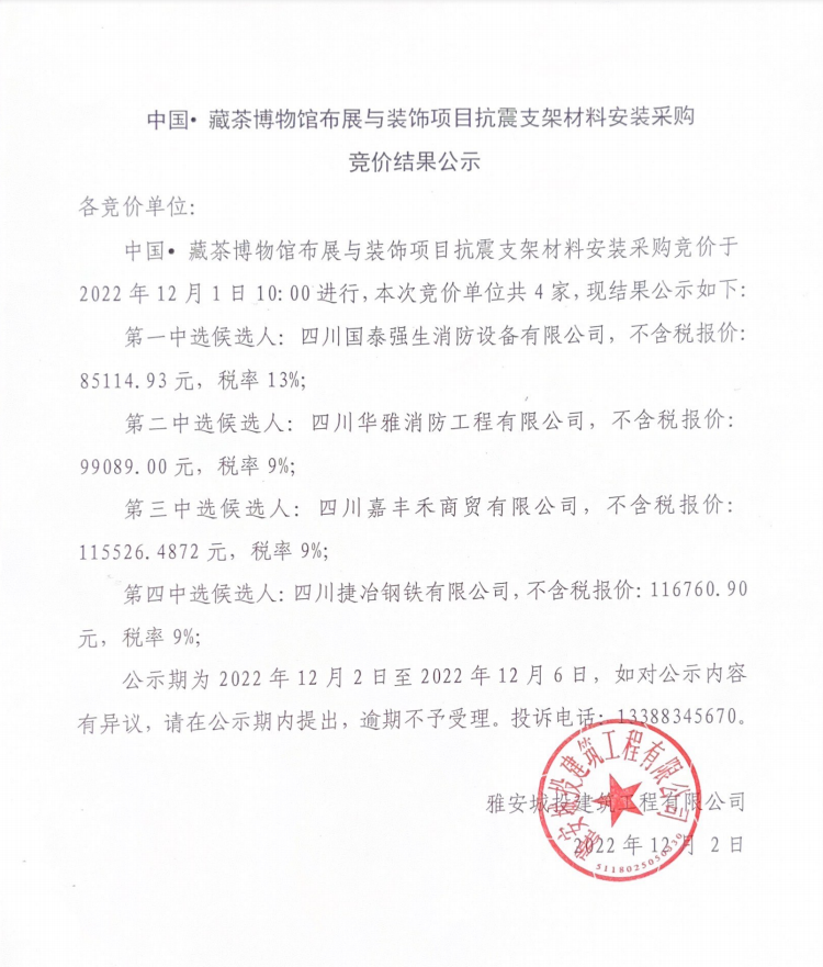中國·藏茶博物館布展與裝飾項目抗震支架材料安裝采購競價結(jié)果公示
