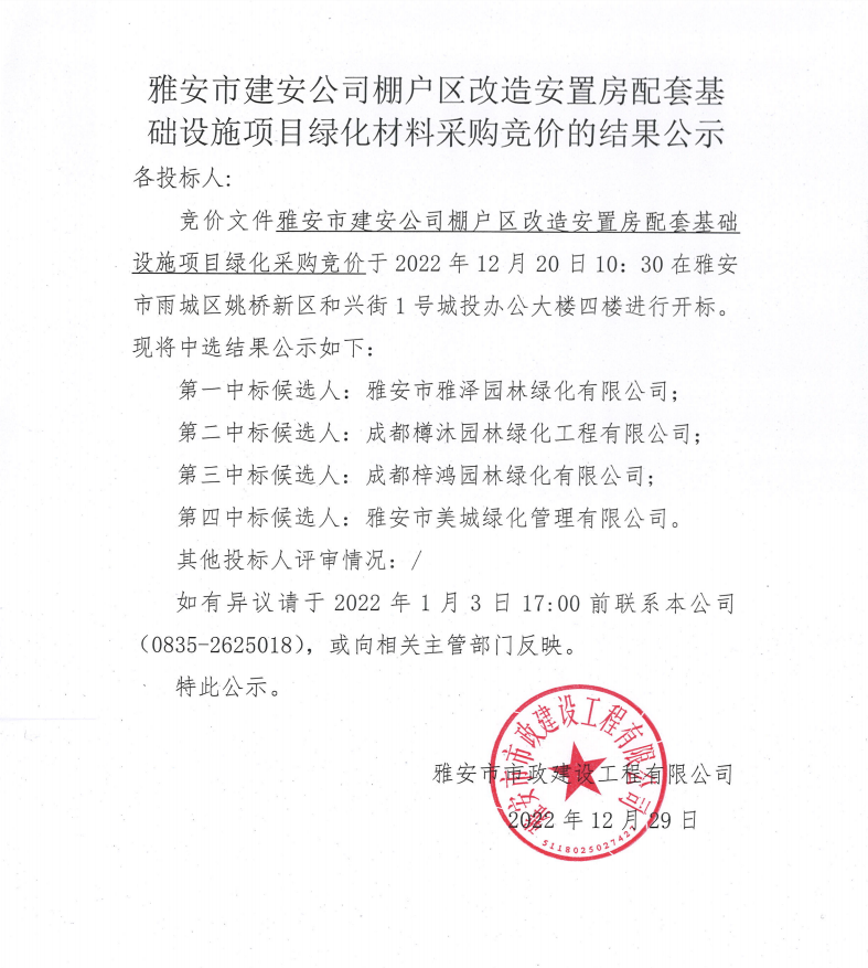 雅安市建安公司棚戶區(qū)改造安置房配套基礎(chǔ)設(shè)施項(xiàng)目綠化材料采購(gòu)競(jìng)價(jià)結(jié)果公示