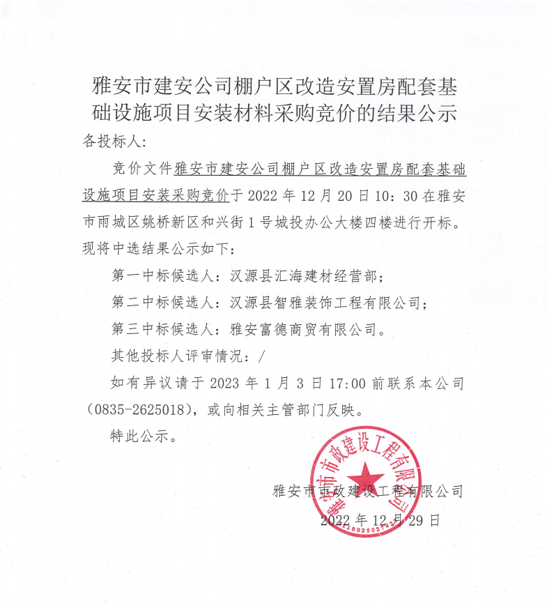 雅安市建安公司棚戶區(qū)改造安置房配套基礎設施項目安裝材料采購競價結果公示