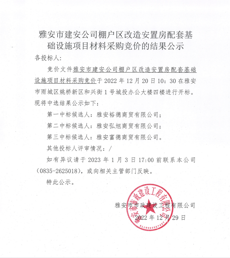 雅安市建安公司棚戶區(qū)改造安置房配套基礎(chǔ)設(shè)施項(xiàng)目材料采購競價(jià)結(jié)果公示