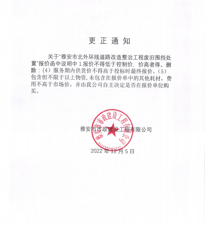 雅安市北外環(huán)道路改造整治工程廢舊圍擋處置詢價(jià)公告(更正通知)