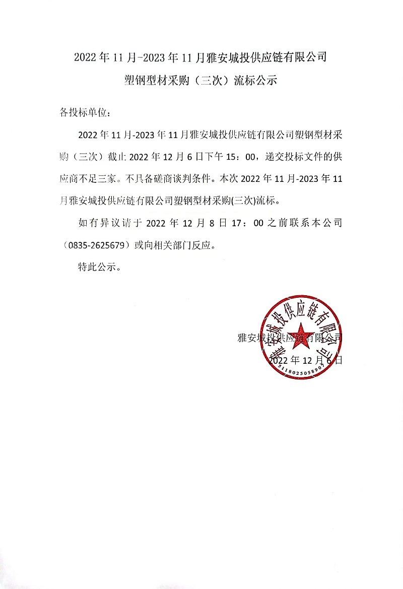 2022年11月-2023年11月雅安城投供應鏈有限公司塑鋼型材采購(三次)流標公示
