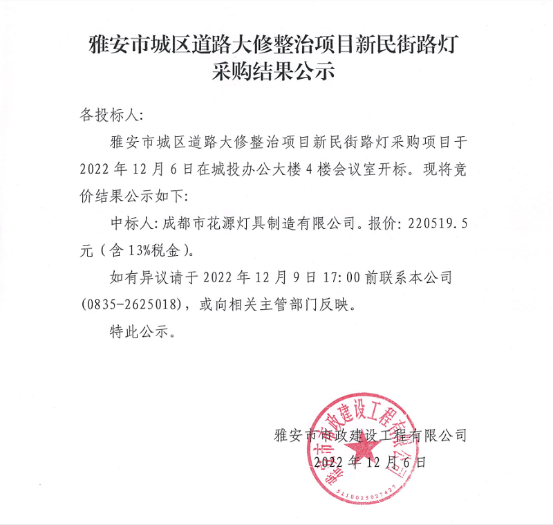 雅安市城區(qū)道路大修整治項目新民街路燈采購結(jié)果公示