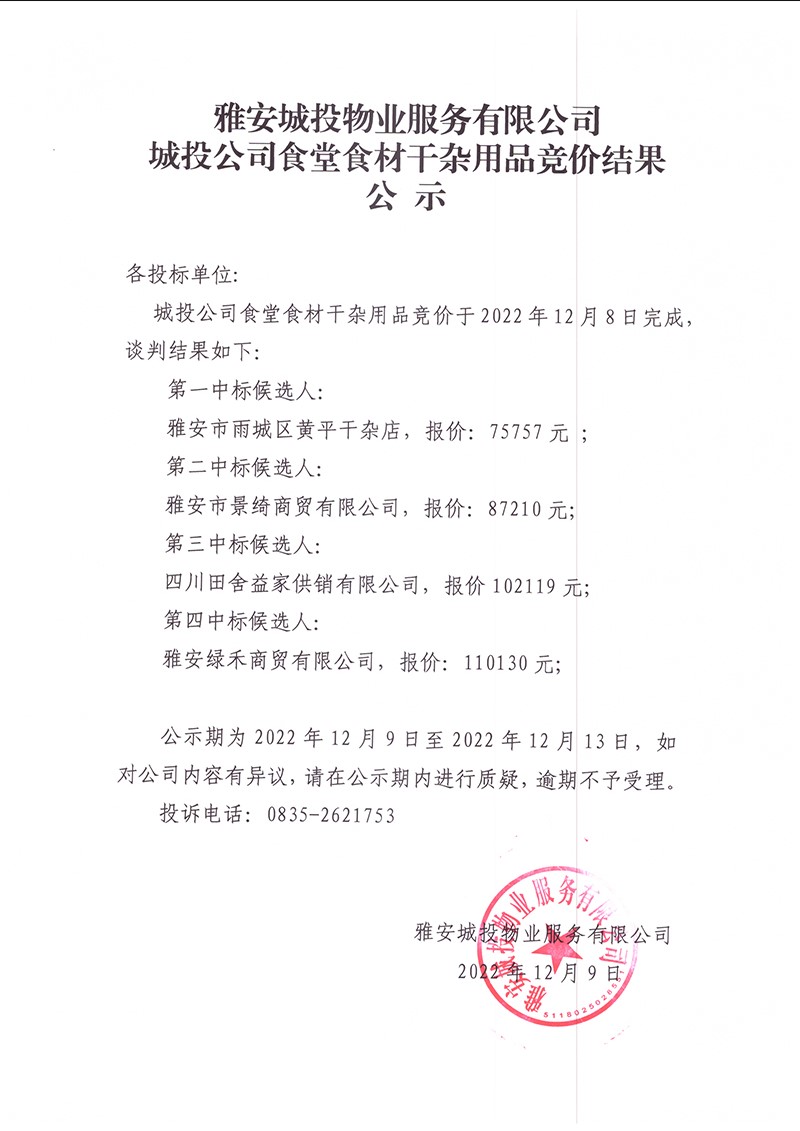 雅安城投物業(yè)服務(wù)有限公司城投公司食堂干雜競價結(jié)果公示
