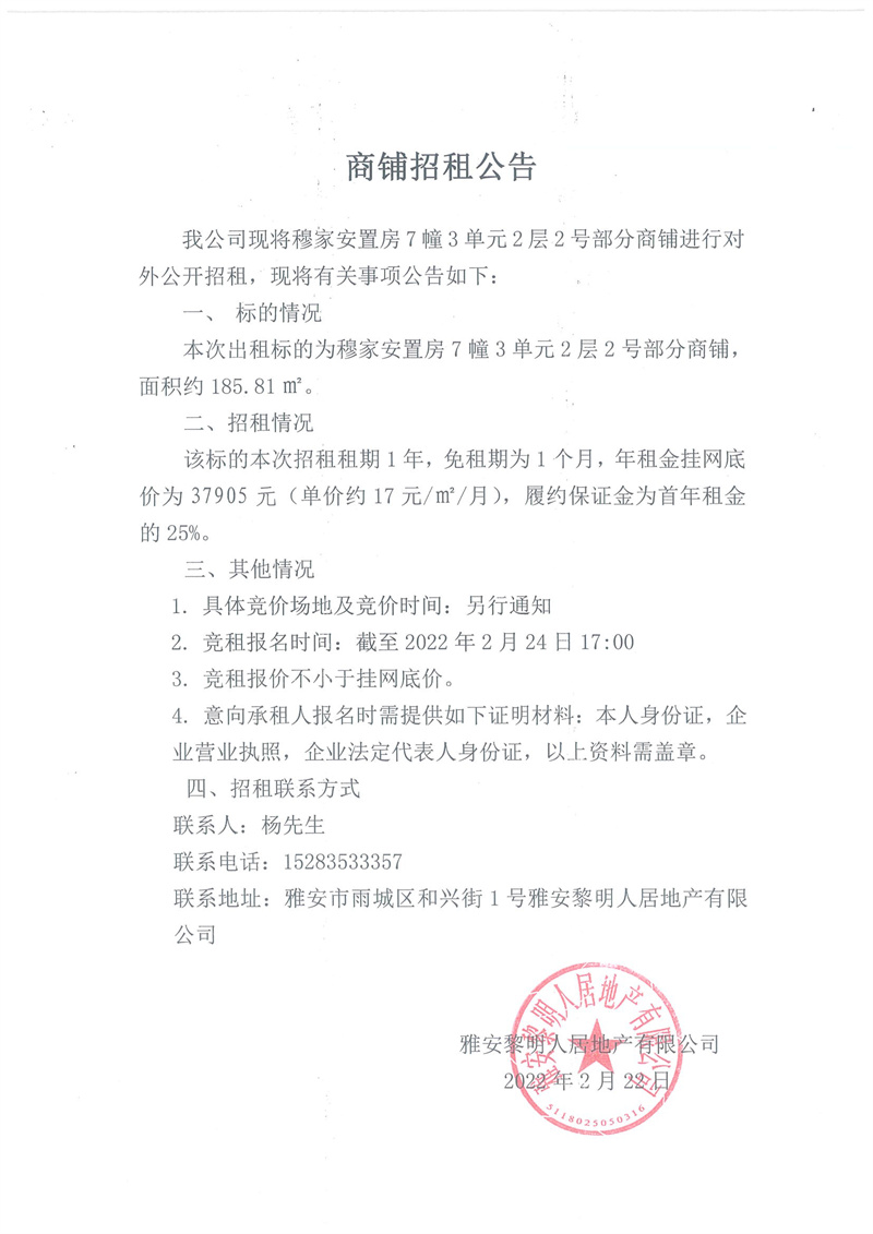 穆家安置房7幢3單元2層2號(hào)部分商鋪招租公告