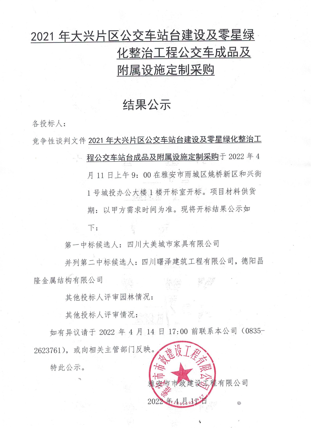 2021年大興片區(qū)公交站臺建設及零星綠地整治工程公交站臺成品及附屬設施定制采購結(jié)果公示
