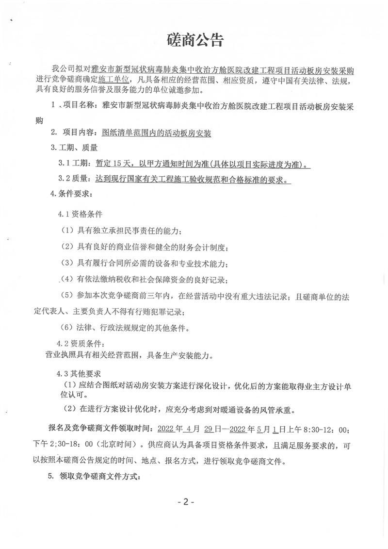 雅安市新型冠狀病毒肺炎集中收治方艙醫(yī)院改建工程項(xiàng)目活動板房采購磋商公告