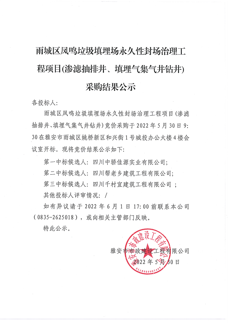 雨城區(qū)鳳鳴垃圾填埋場(chǎng)永久性封場(chǎng)治理工程項(xiàng)目(滲濾抽排井、填埋氣集氣井鉆井)采購(gòu)結(jié)果公示
