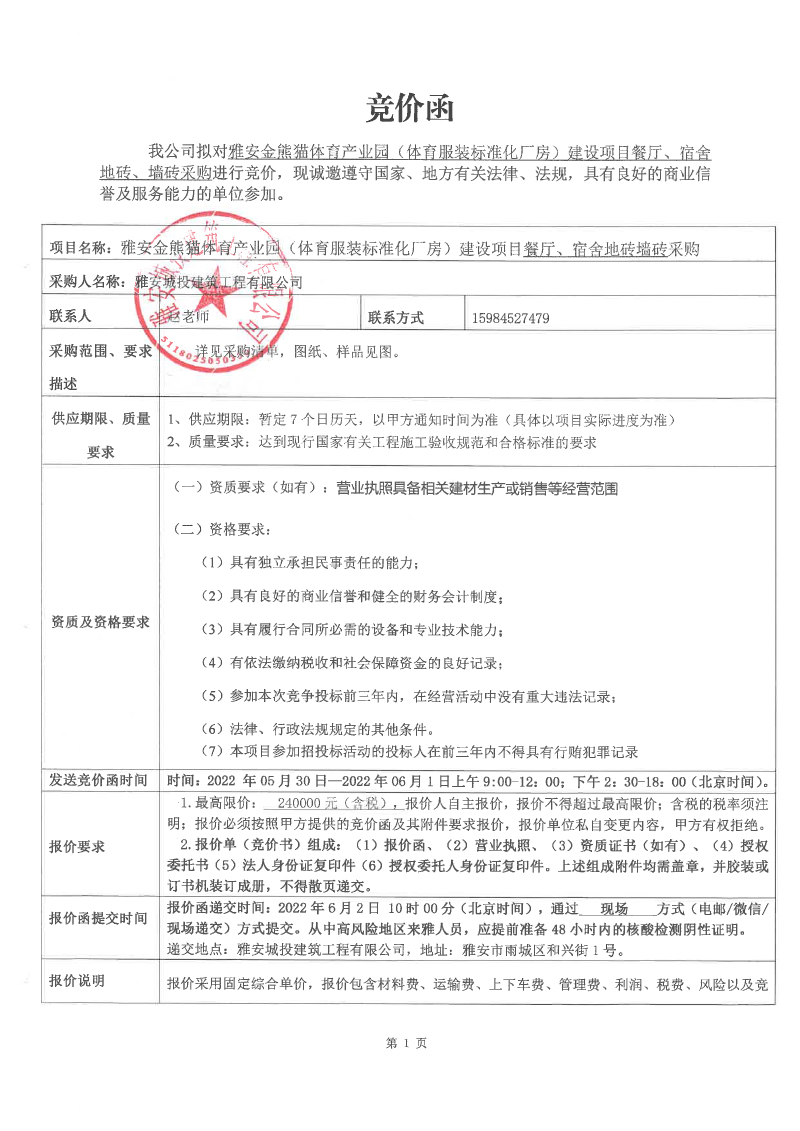雅安金熊貓?bào)w育產(chǎn)業(yè)園(體育服裝標(biāo)準(zhǔn)化廠房)建設(shè)項(xiàng)目餐廳、宿舍地磚、墻磚競價(jià)采購