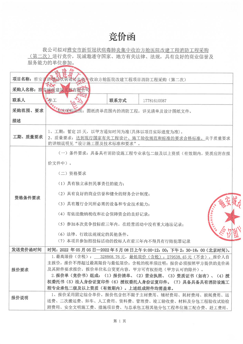 雅安市新型冠狀病毒肺炎集中收治方艙醫(yī)院改建工程項(xiàng)目消防工程競(jìng)價(jià)公告(第二次)
