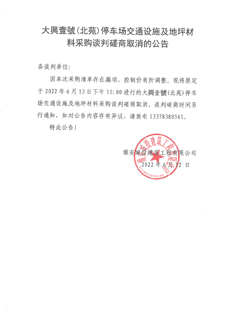 大興壹號(北苑)停車場交通設(shè)施及地坪材料采購談判磋商取消的公告
