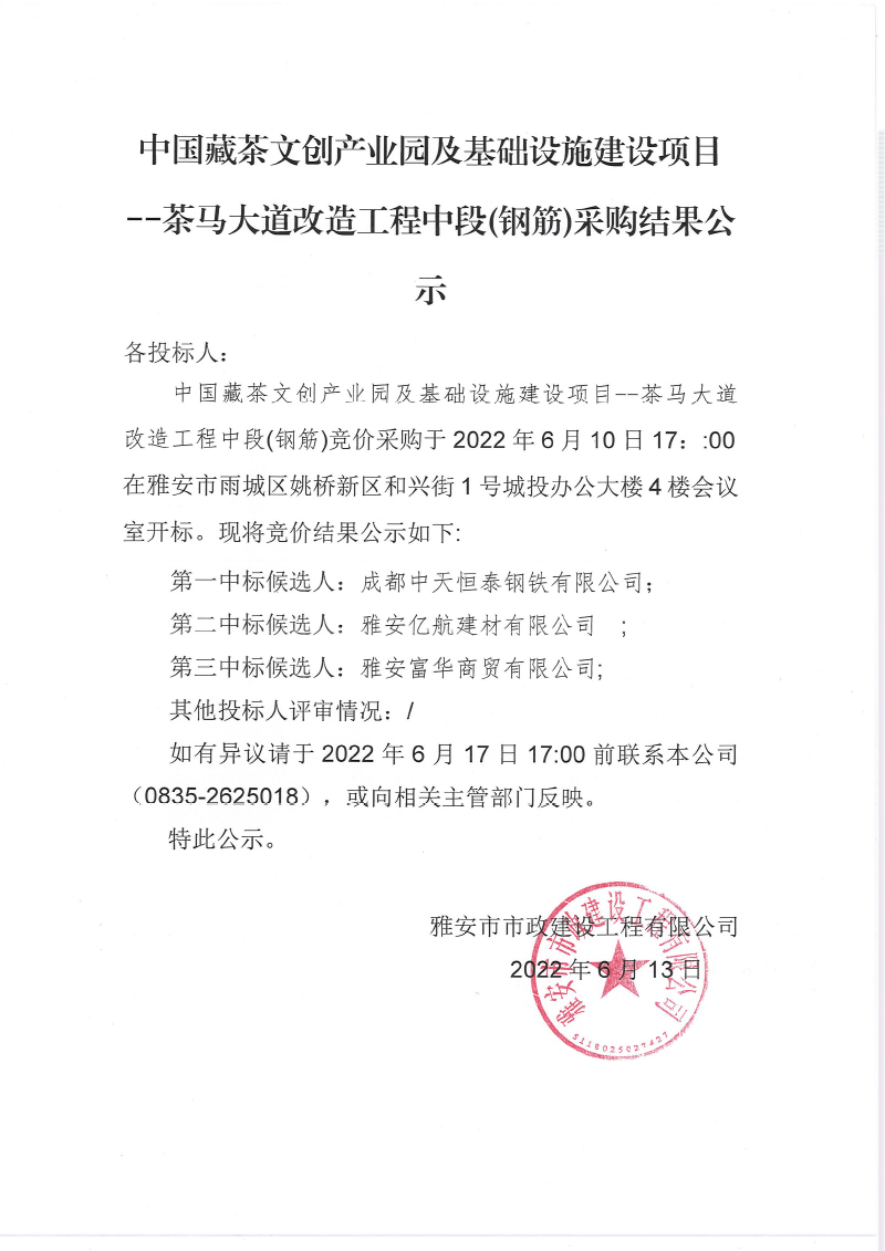 中國藏茶文創(chuàng)產(chǎn)業(yè)園及基礎(chǔ)設(shè)施建設(shè)項(xiàng) 茶馬大道改造工程中段鋼筋采購結(jié)果公示