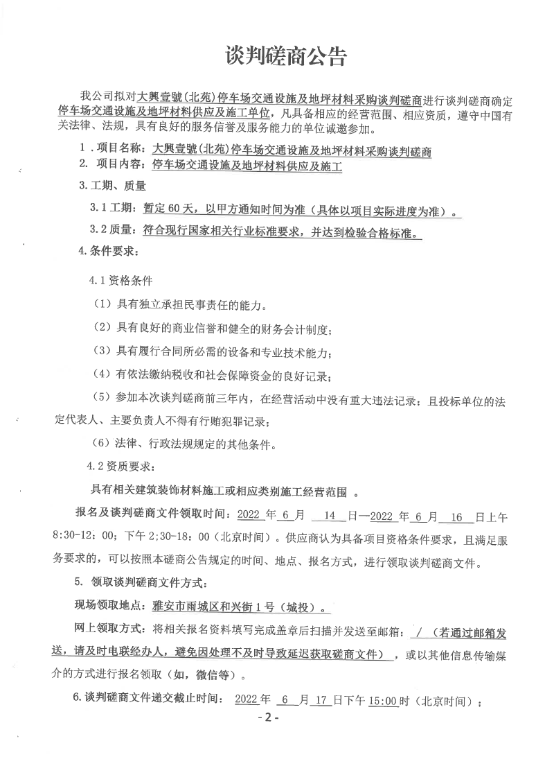 大興壹號(北苑)停車場交通設施及地坪材料采購談判磋商公告